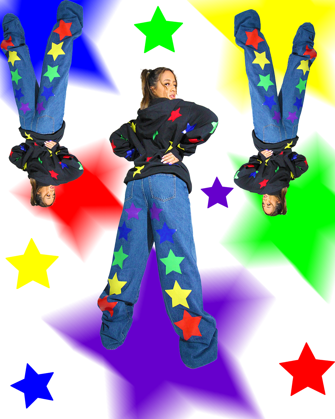 Lina is a size small and 5'0 but is wearing a size M for an oversized look
